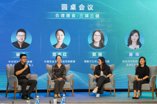 随后的圆桌讨论中,中国农业大学食品学院教授范志红、塔斯汀公共事务副总裁默杨、联合利华营养与健康亚洲区负责人唐炜围绕促进合理膳食相关公众行为改变,以及如何推动餐饮业及社会餐厅提升营养健康服务水平、创新适应现代健康需求餐饮服务的举措等话题展开讨论。